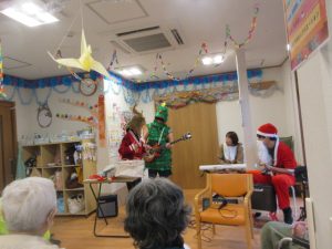 職員バンドによるクリスマスソングなどで、手拍子をしたり一緒に口ずさんだりと、