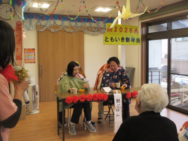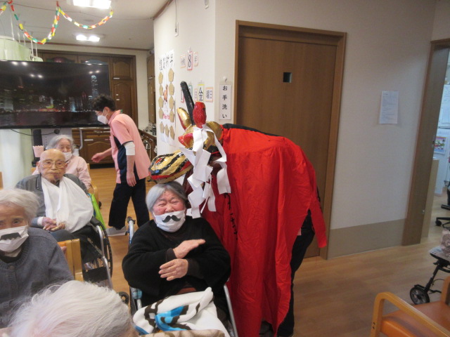 職員による恒例の出し物のひげダンスや二人羽織を披露し、会場は笑い声と拍手に包まれました。 また獅子舞も登場し、利用者の皆様ひとりひとりに頭を噛んでいただき無病息災を祈念いたしました。 笑顔あふれる新年のスタートとなり、職員一同今年も皆様と楽しい時間を大切にしていきたいと思います。